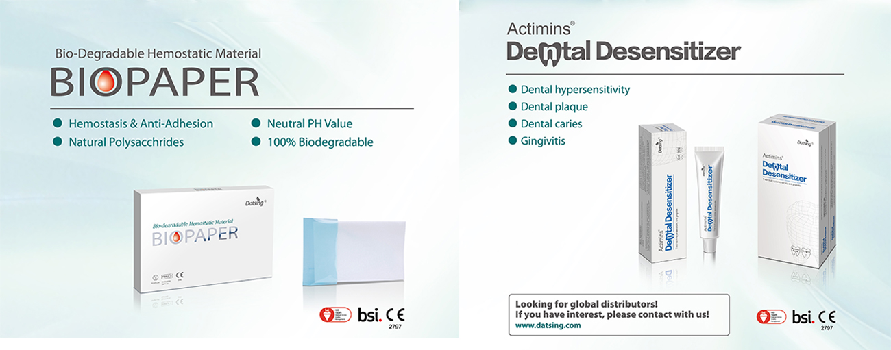 我公司產品大清生物紙可吸收止血材料BIOPAPER及奧敏清牙齒脫敏劑ACTIMINS均已獲得歐洲權威認證機構BSI CE認證,自2015年底開始國際業務以來,產品已遠銷法國、意大利、瑞士、波蘭、泰國、馬來西亞、印尼和越南等國家。